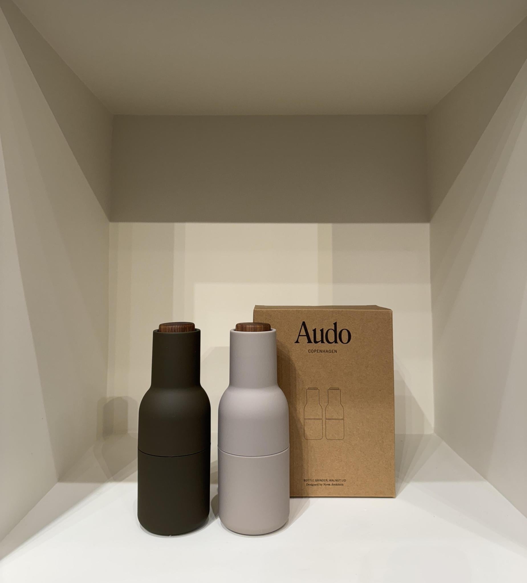 Salt and pepper bottle grinders, hunting green and beige with a walnut lid. Made of plastic, ceramic, and walnut wood. Each set includes two BPA free bottle grinders