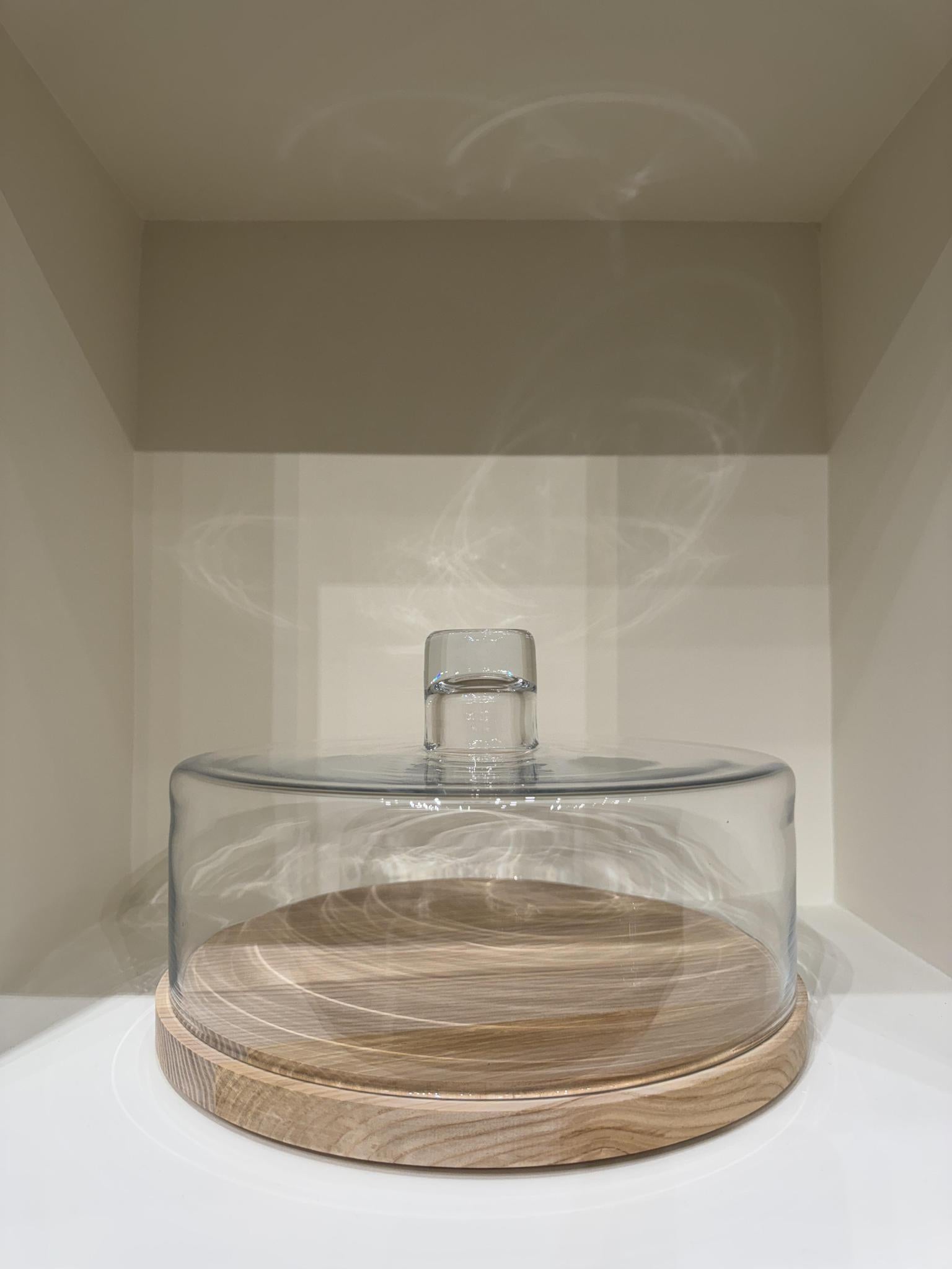 A low, wide glass dome with a flat lid and hollow handle, mouth blown together as one piece of glass. The dome sits on a sustainably-sourced, untreated FSC-certified ash wood base. The natural wood board can be treated with food safe oils or left to mature and colour naturally.
