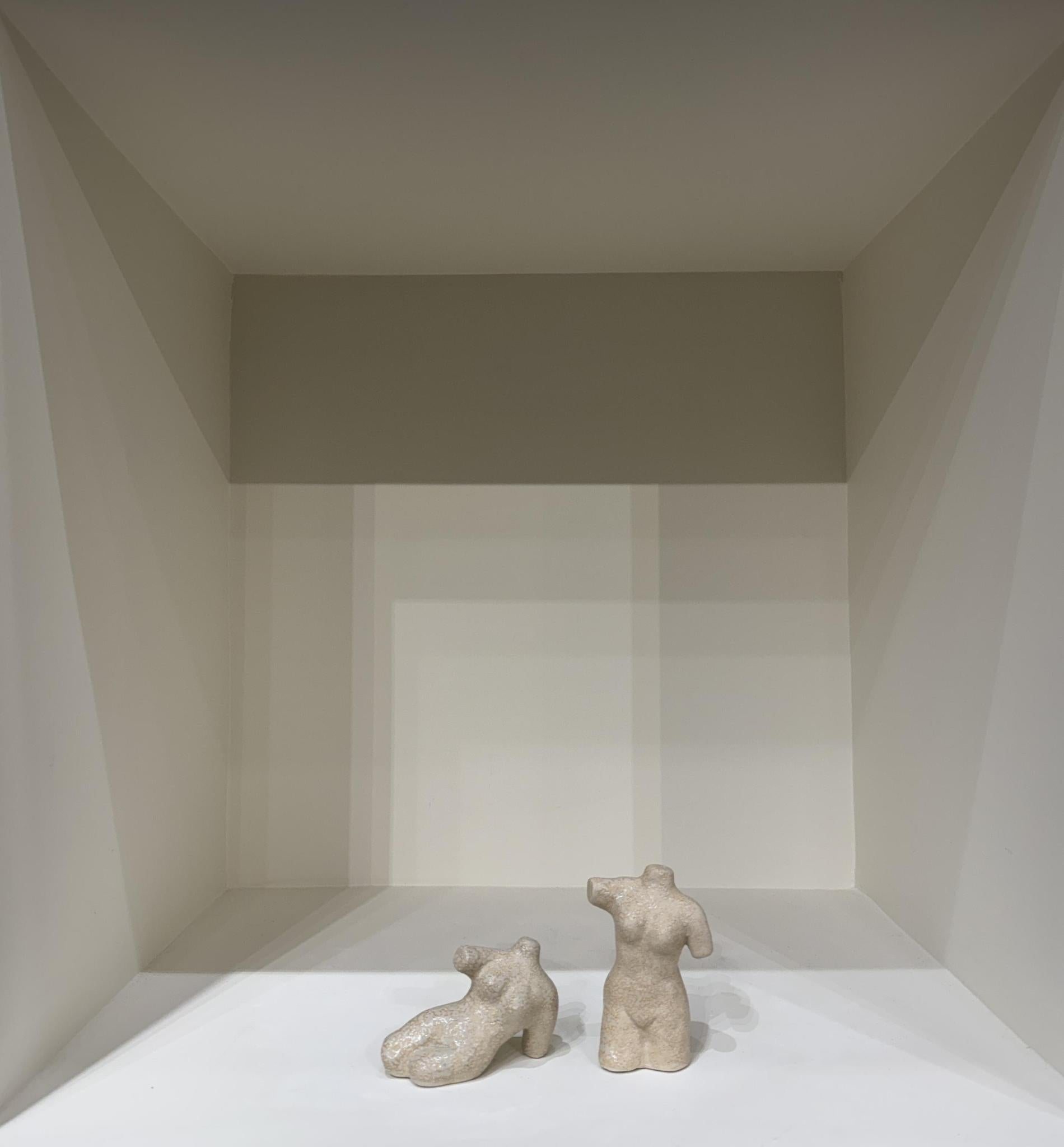 This ceramic sculpture set comes with 2 aphrodite sculptures finished with a textured reactive cream glaze